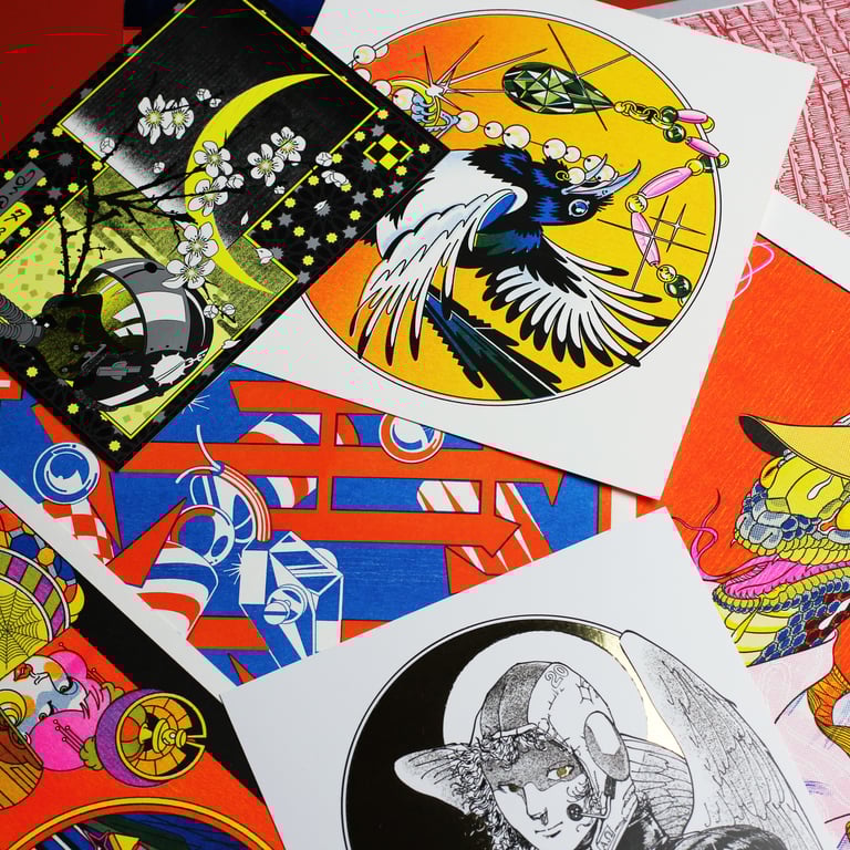A selection of 4 random prints and postcards from the print archive (2011–2018). In various sizes (max. A4) and various printing techniques (risograph, offset, etc), signed and unsigned. Free shipping worldwide.